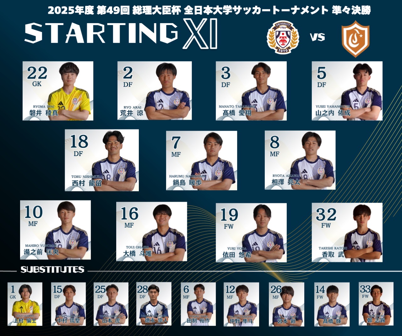 後半 どちらも点がない中で迎えた後半。関東同士の対戦だからこそ芽生える闘争心の中で遂に得点が動いた。2分、MF鍋島のロングパスをDF荒井が上手くトラップし、クロスをあげる。そのクロスをFW香取がうまく頭で合わせて得点。先制点を獲得した東洋大は8分、MF鍋島かふぁボールを受けたFW香取が独特のタイミングでシュートを放つもまたもやバーに弾かれる。その後のボールも回収し、ゴールに迫るも得点ならず。立て続けにFW香取がゴールを狙うも追加点にはならない。そして25分、FW香取→8番MF相澤→DF西村がクロスをあげるも相手にクリアされてしまう。しかしそのクリアボールを7番MF鍋島がダイレクトボレーでゴールを突き刺し、追加点を獲得する。その後は守る展開が続くも、GK磐井のスーパーセーブで相手にゴールを割らせない。しかしアディショナルタイム2分、惜しくも失点を許してしまう。そしてアディショナルタイム4分、相手に左サイドを突破されゴール前でパス、ダイレクトでシュートをうたれるも、再びGK磐井が神セーブを魅せる。ここで試合終了。