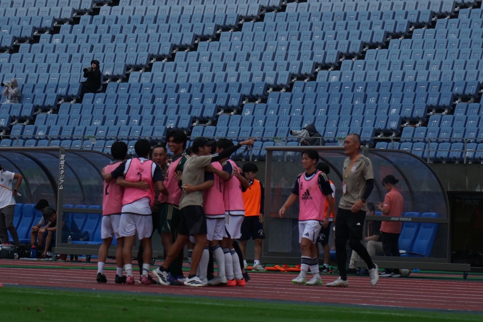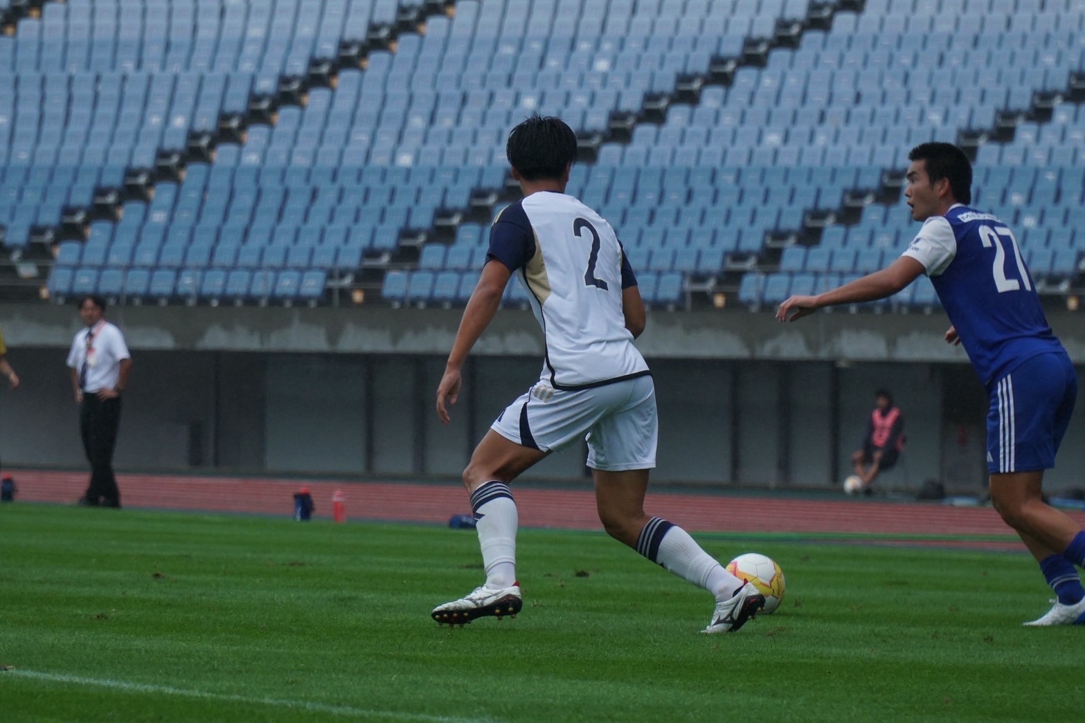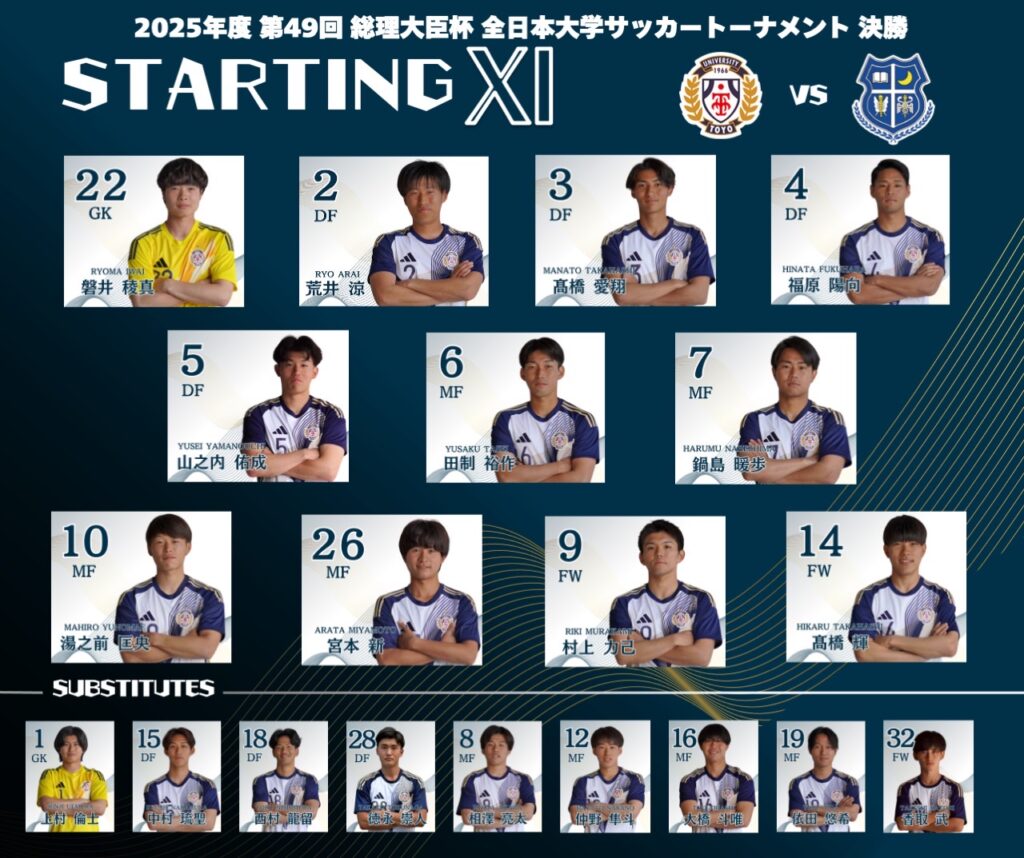 後半  スコアレスドローで迎えた後半。90分で終わらせ優勝するためにも1点を獲得したい東洋大はハーフタイムで気持ちを確かめ合い、試合に挑む。後半は東洋大ペースで進められる時間帯が続いた。14分、DF荒井のクリアに反応したFW髙橋(輝)がうまく裏に抜けシュートを放つも、相手GKのセーブし、先制点は獲得できず。20分、MF鍋島が10番MF湯之前にパスを出し、ペナルティエリア外からシュートを狙うも相手GKのセーブ。その直後25分にもワンツーで抜け出したFW髙橋(輝)がシュートを放つも相手GKの壁が厚い。29分、MF湯之前の縦パスに19番FW依田が反応し、再びMF湯之前に落としクロス。最後はFW髙橋(輝)がヘディングで合わせるも枠外となる。しかし遂に得点が動く。38分、フリーになっていたMF湯之前を狙い、MF鍋島が放ったクロスが直接ゴール!東洋大が先制点を獲得する。アディショナルタイムまで追加点を狙った東洋大だが、うまくタイミングが合わない。ただここで試合終了。遂に日本一の称号を手にした。